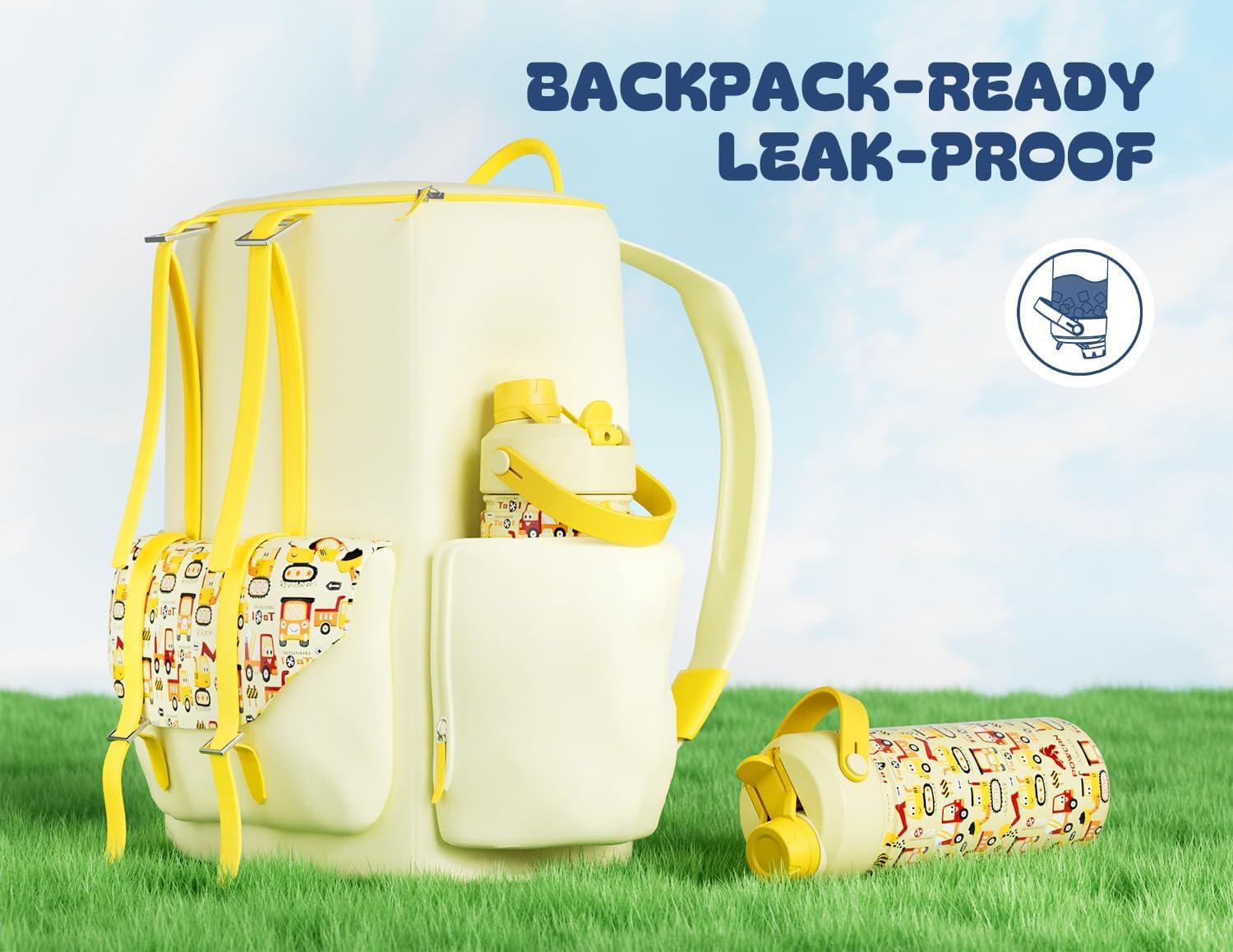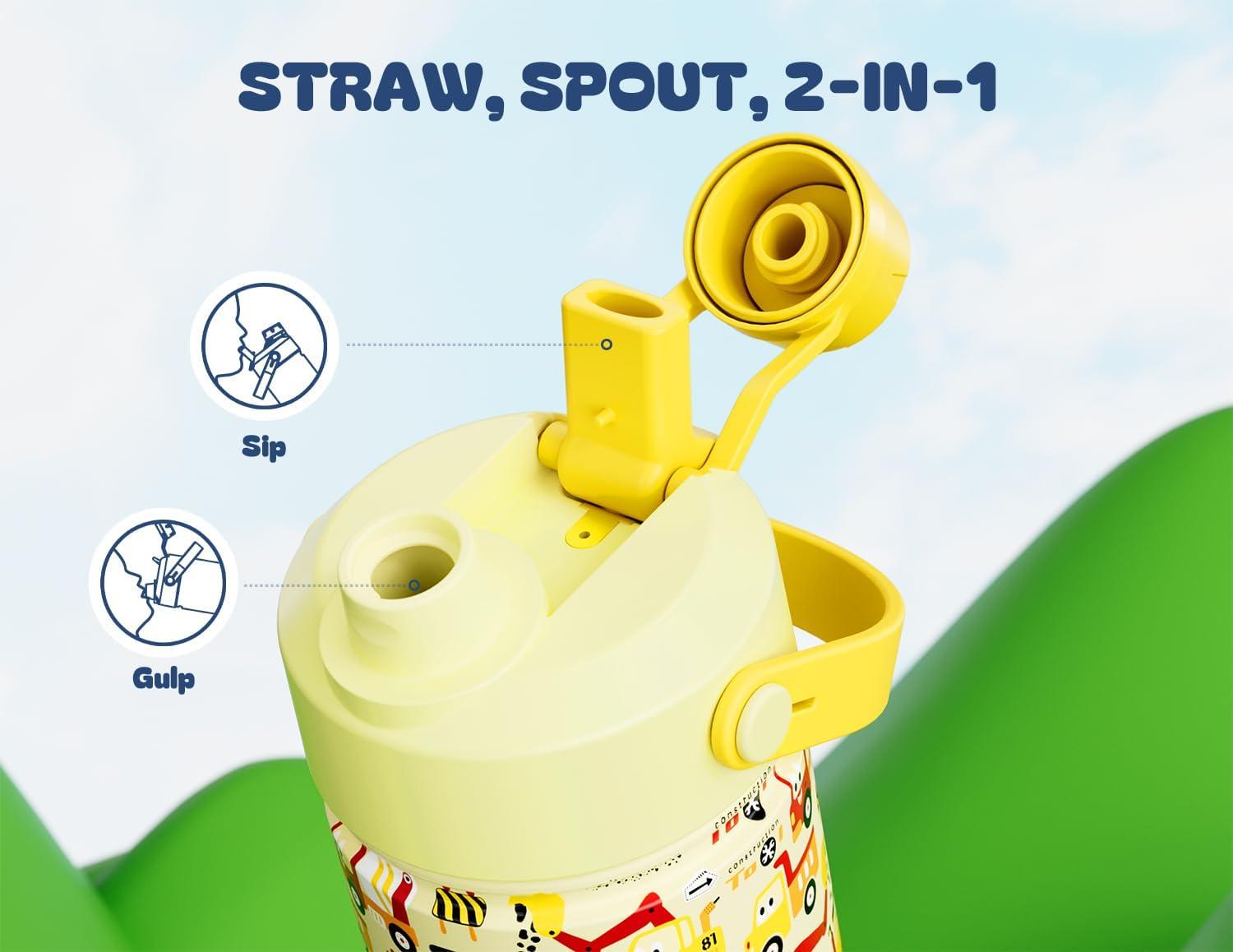 2-in-1 Leakproof Lid: Kids can sip with the straw or take a quick gulp – whatever they prefer. The secure lid prevents leaks in car seats, tote pockets, or lunch bags, making it a parent favorite.