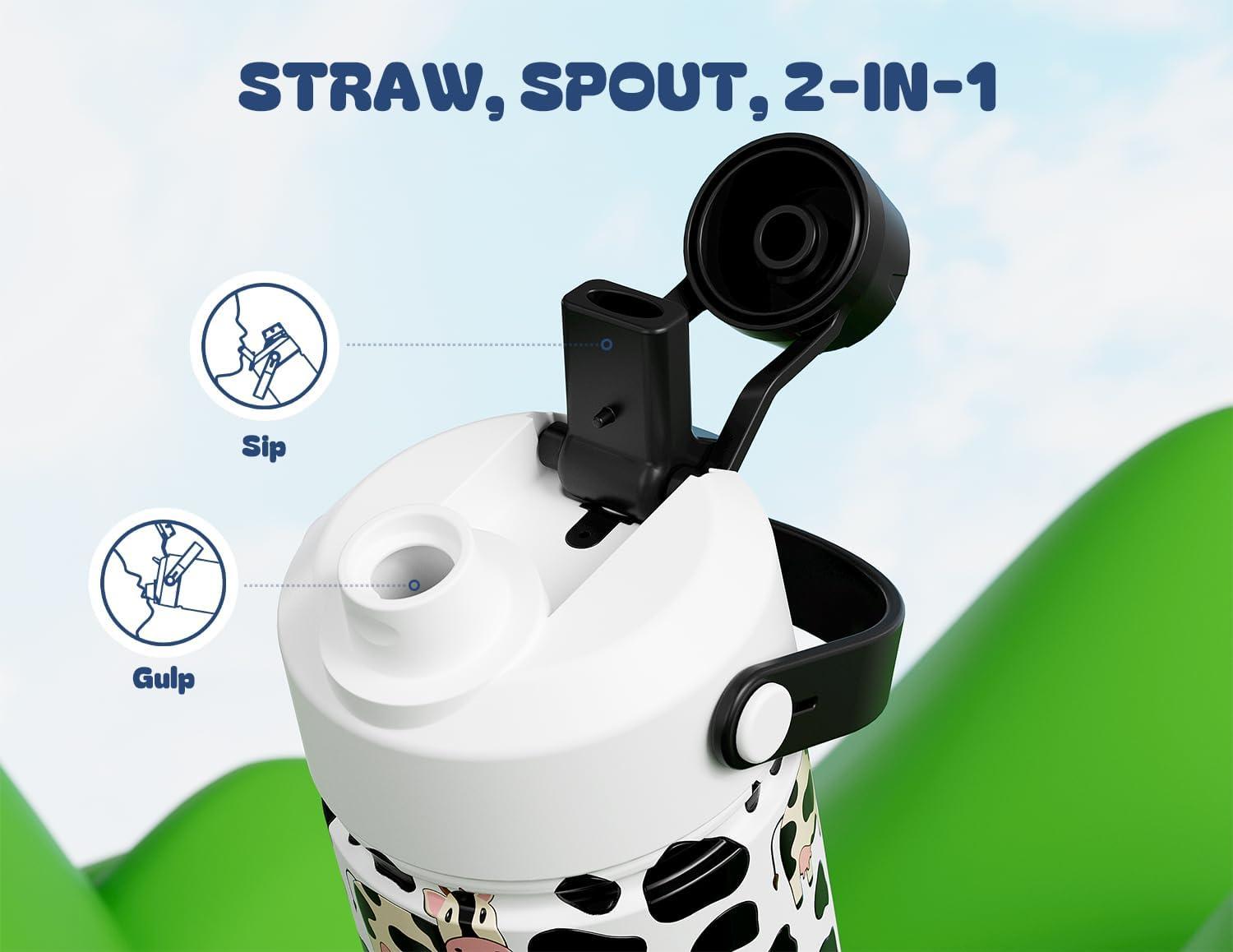 2-in-1 Leakproof Lid: Kids can sip with the straw or take a quick gulp – whatever they prefer. The secure lid prevents leaks in car seats, tote pockets, or lunch bags, making it a parent favorite.