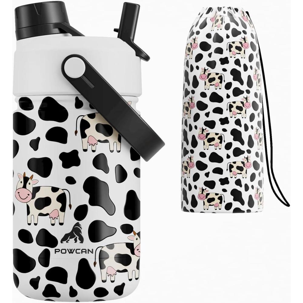 18 oz Kids Stainless Steel Water Bottle: Spill-Proof, Insulated Cup with Straw Spout Lid, BPA-Free, Car Cupholder Friendly, Durable, 24H Cold for Camping, Sports, Birthday Gift for Boys (Dinosaur-Era)(Moo Moo Cow (with Carrier Bag))