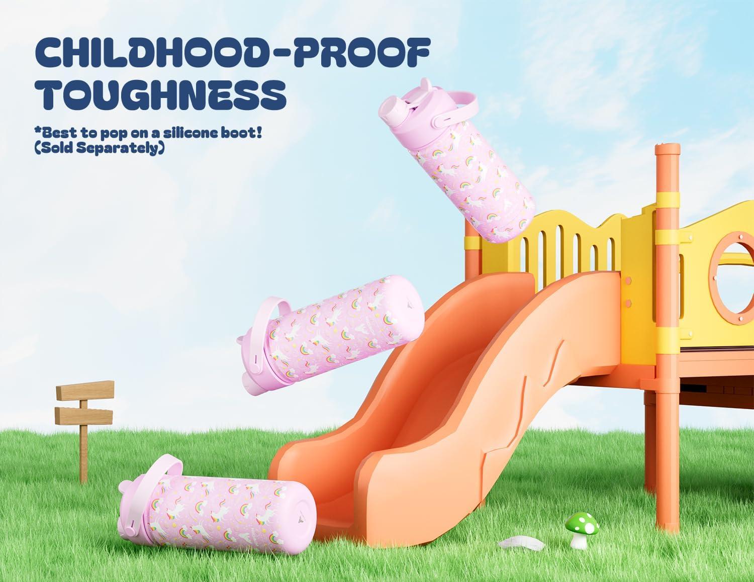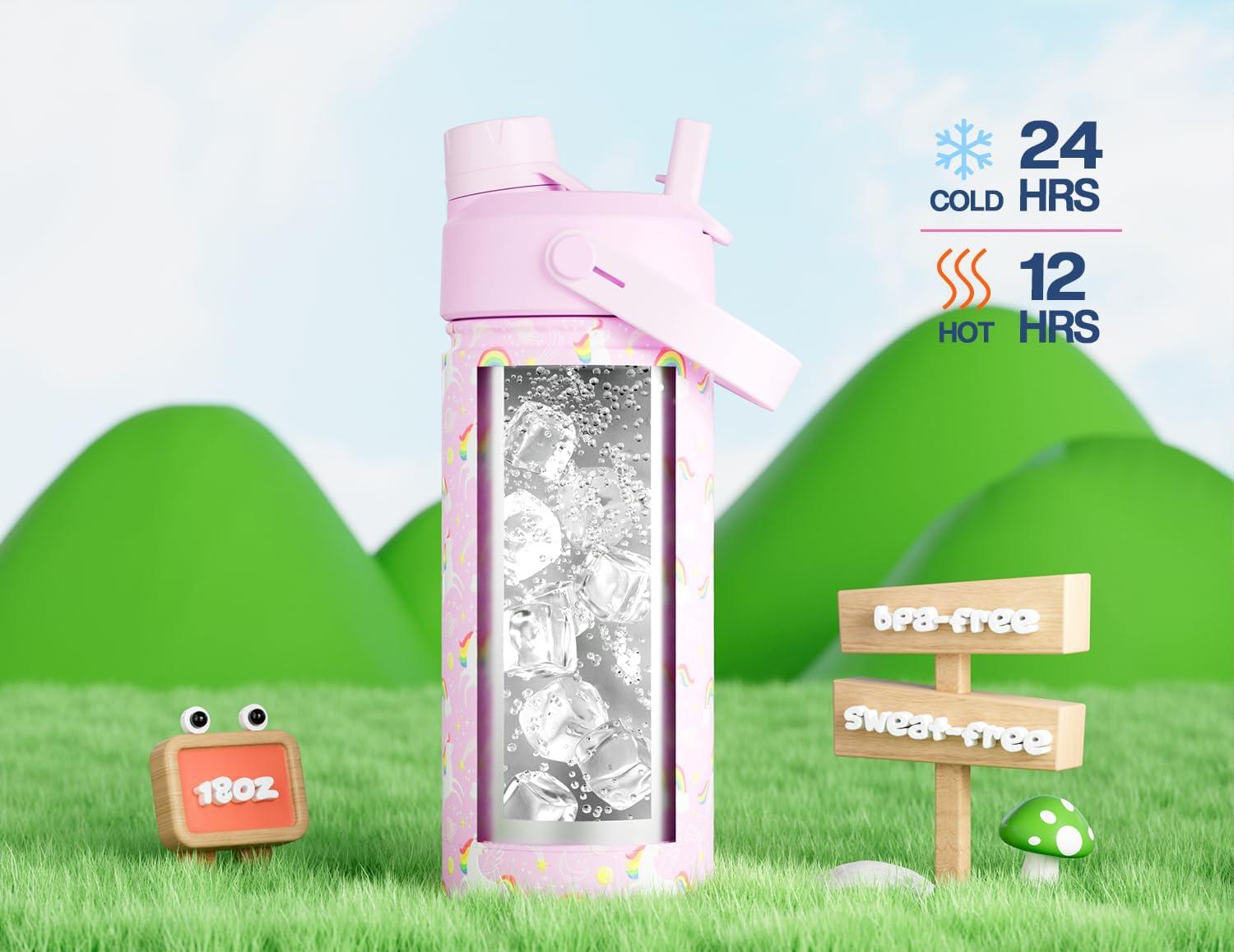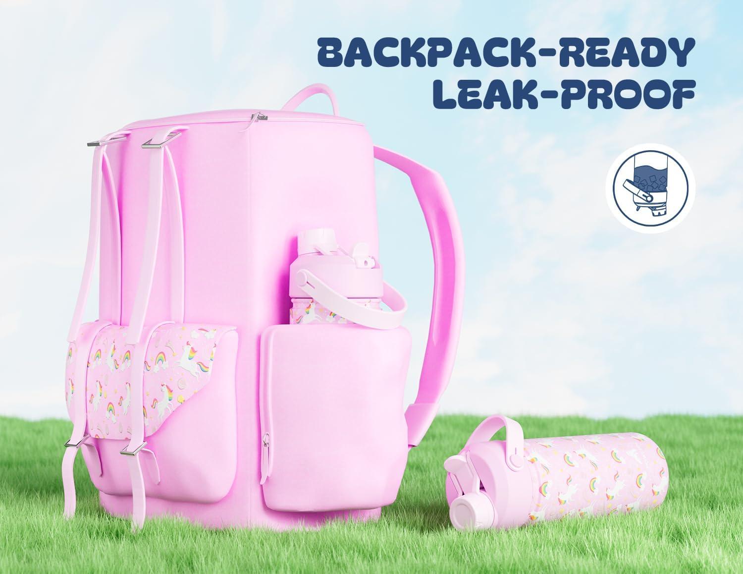 Rainbow Unicorn: Add a splash of magic with this soft pink unicorn bottle! Perfect for little dreamers who love rainbows, fairytales, ideal for travel or a day at the park!