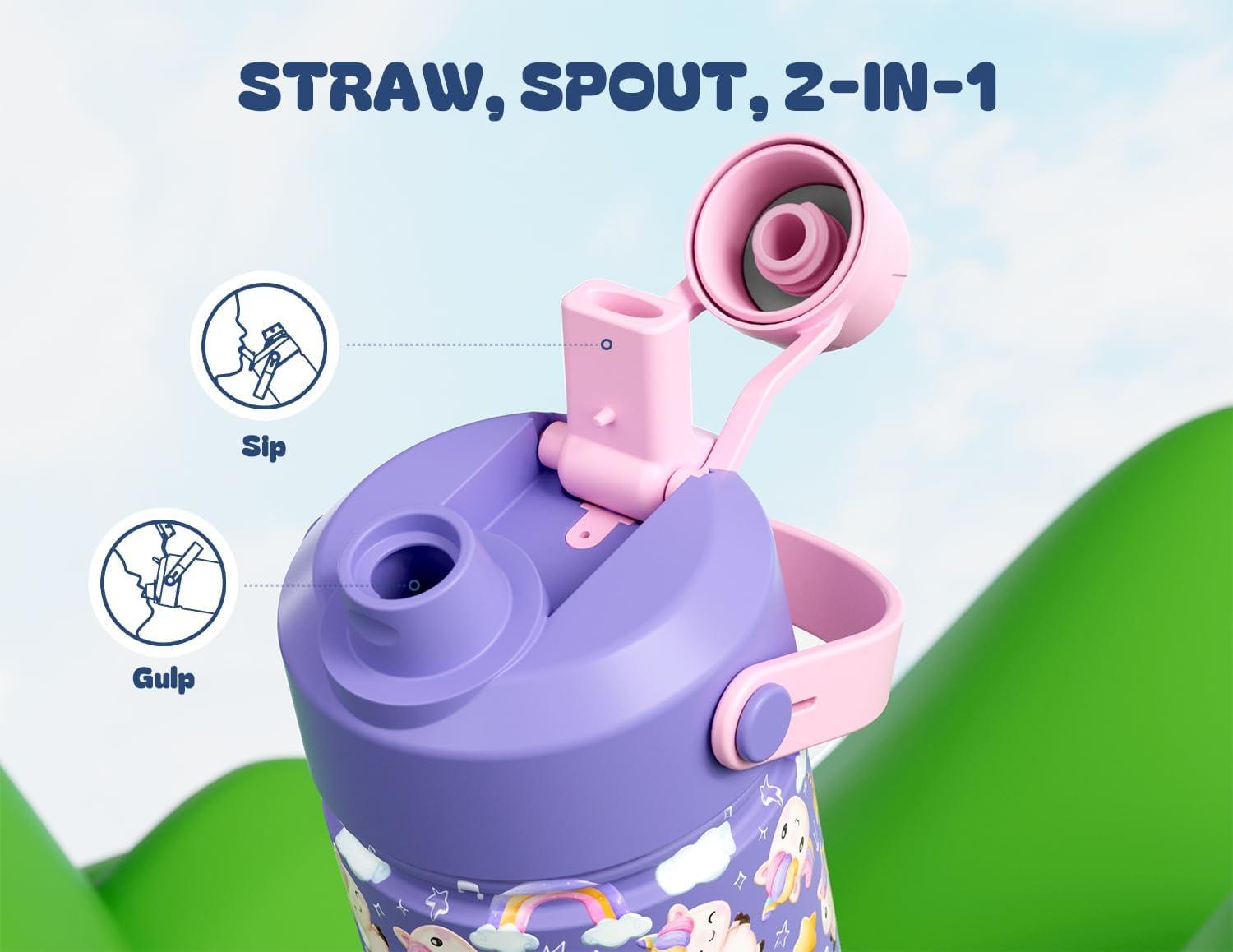 2-in-1 Leakproof Lid: Switch between a straw sipping or quick gulping with a leak-proof lid; No spills in backpacks, car seats, or lunchboxes – parents will appreciate the mess-free design.