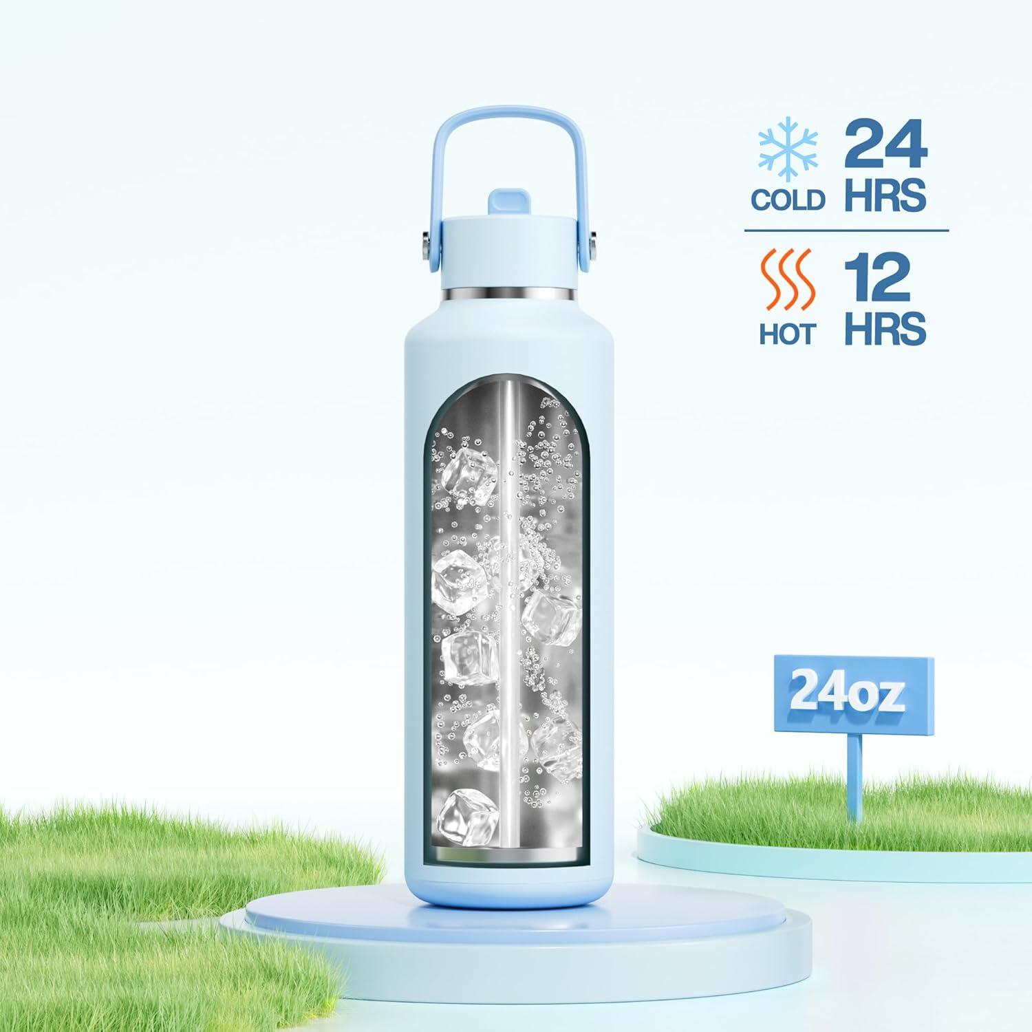 imagePOWCAN 24 oz Slim Insulated Water Bottle with Straw Leakproof Keep Cold 24H Cupholder Friendly Top Handle BPAfree Stainless Steel Water Bottle for Sport Travel School Gym Midnight BlackSea Breeze