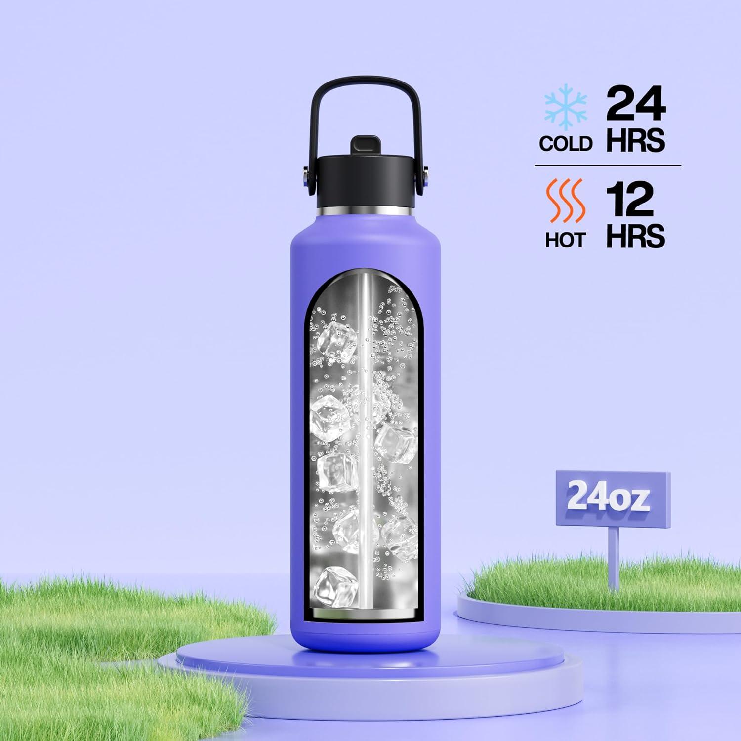 imagePOWCAN 24 oz Slim Insulated Water Bottle with Straw Leakproof Keep Cold 24H Cupholder Friendly Top Handle BPAfree Stainless Steel Water Bottle for Sport Travel School Gym Midnight BlackTwilight Night
