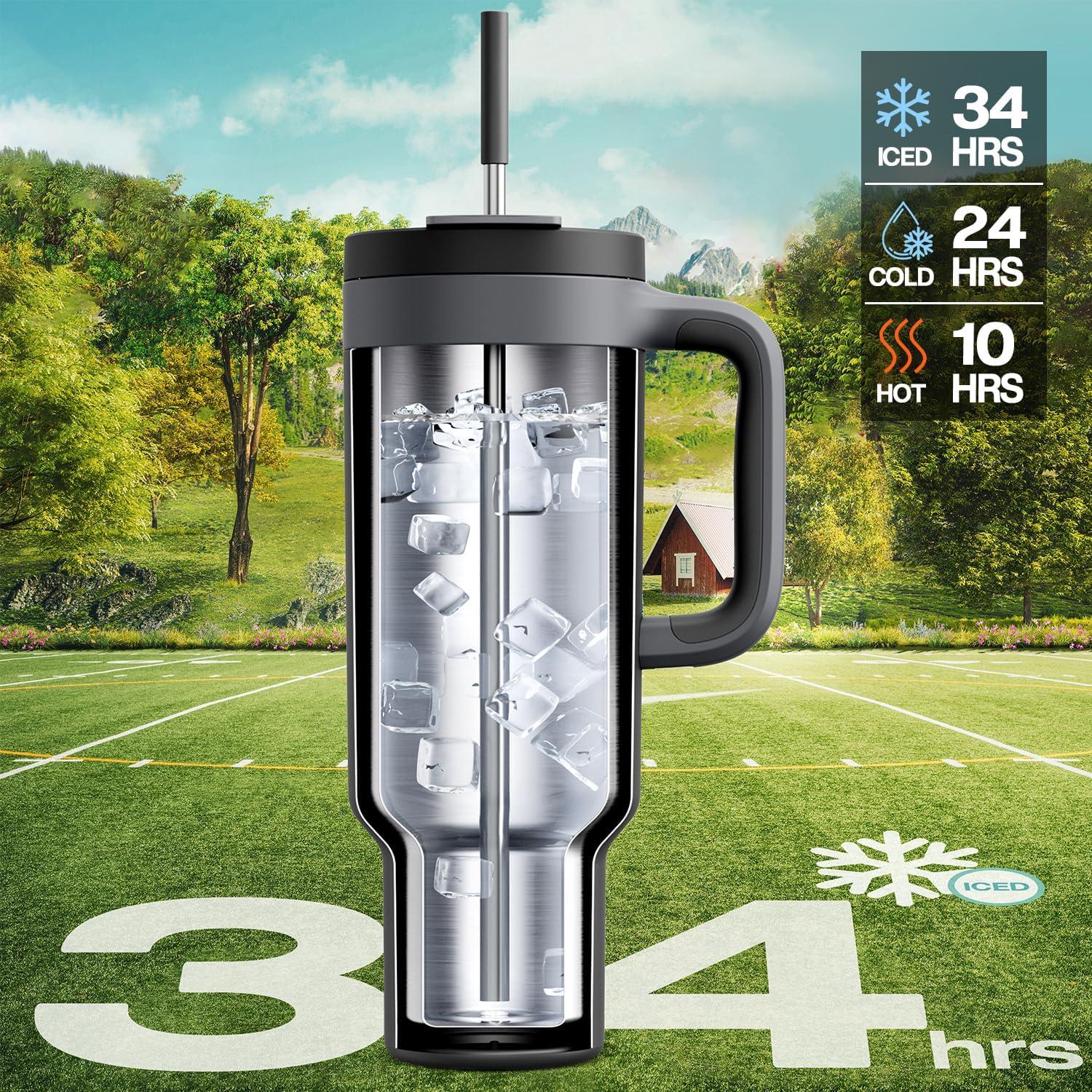 On-the-go buddy: Cruise through with sips, without breaks; Our 40 oz tumbler with handle fits most car cupholders,less refills for endless road fun